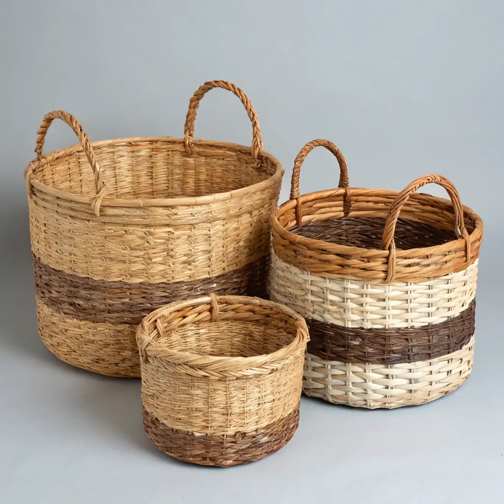 Set of two woven storage baskets crafted from eco-friendly fibers, designed for organization and style. The baskets feature a tight weave with reinforced rims and handles for easy carrying. Their neutral tones and classic design make them suitable for closets, shelves, or as decorative storage solutions. These baskets combine functionality with artisanal craftsmanship, perfect for any home.
